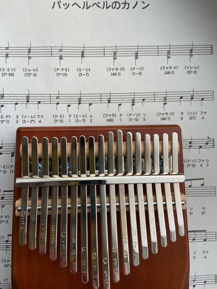すっかり音色に魅了され、隙間時間で練習しているカリンバ。音階の並び方も覚えてきたところで、自分への課題曲として「パッヘルベルのカノン」を練習している。やはりまだカリンバという楽器に慣れていないとみえて楽譜とカリンバを交互に見ながら弾いていると、途中でどこまで弾いたのかわからなくなる。