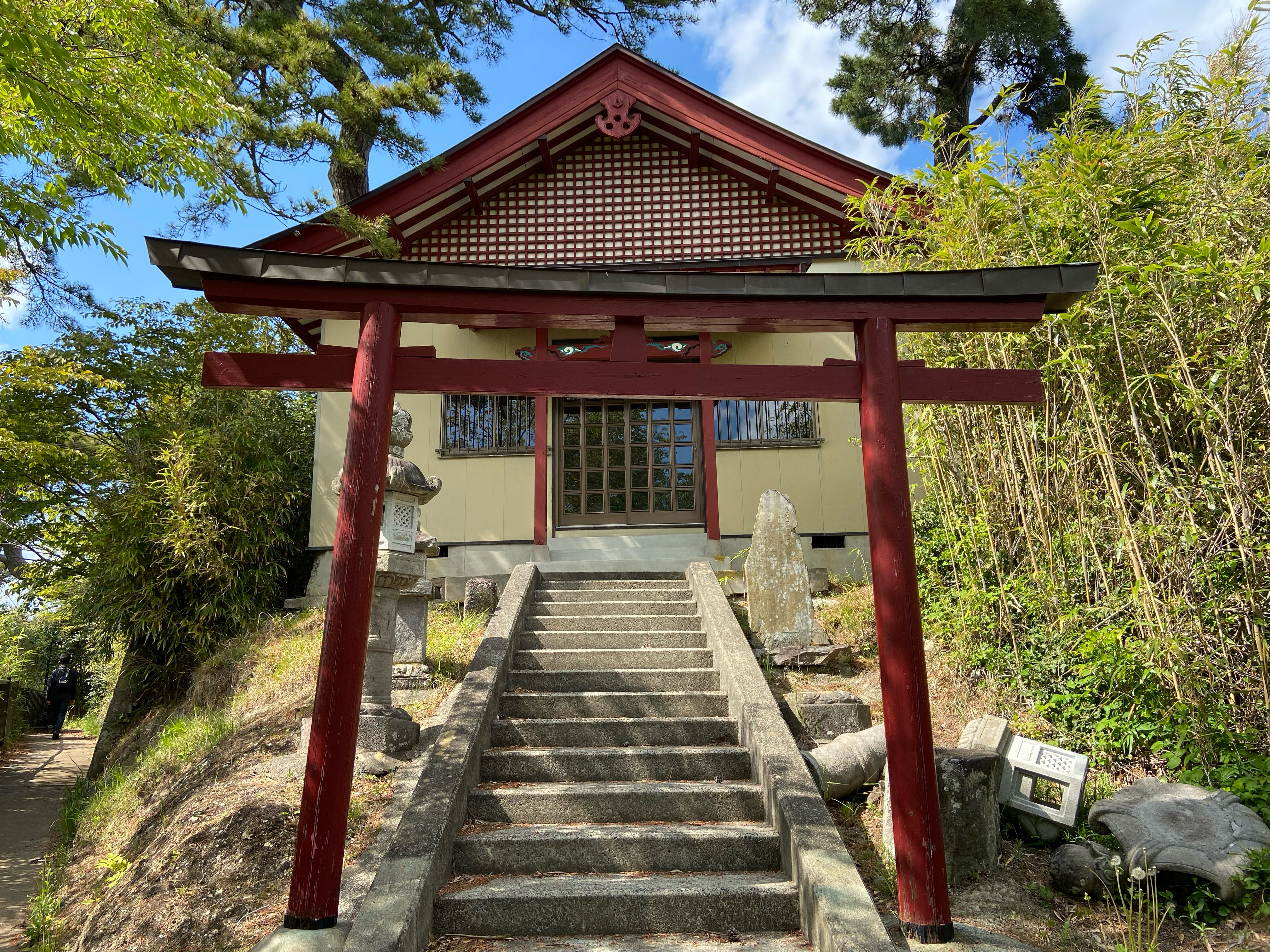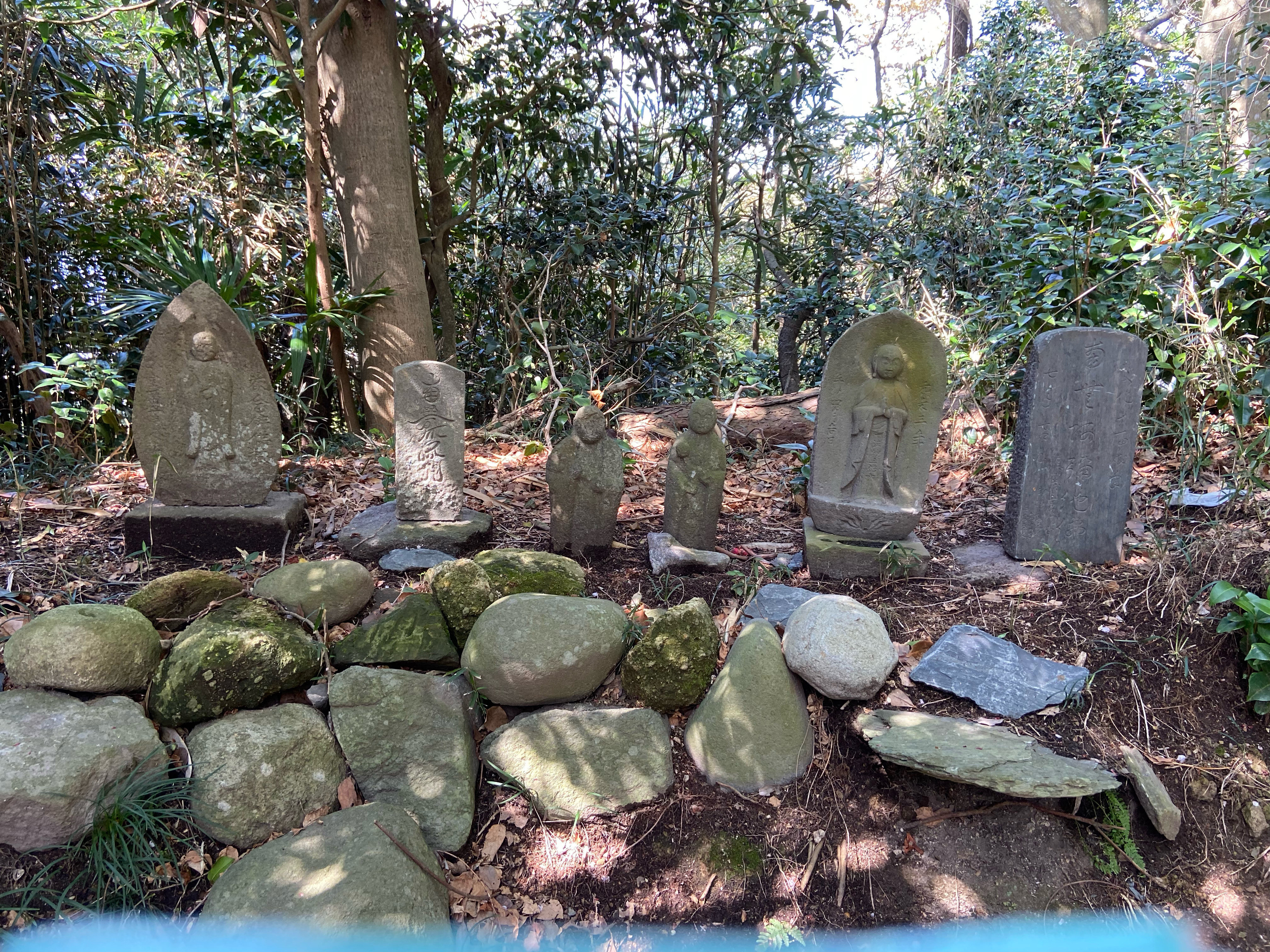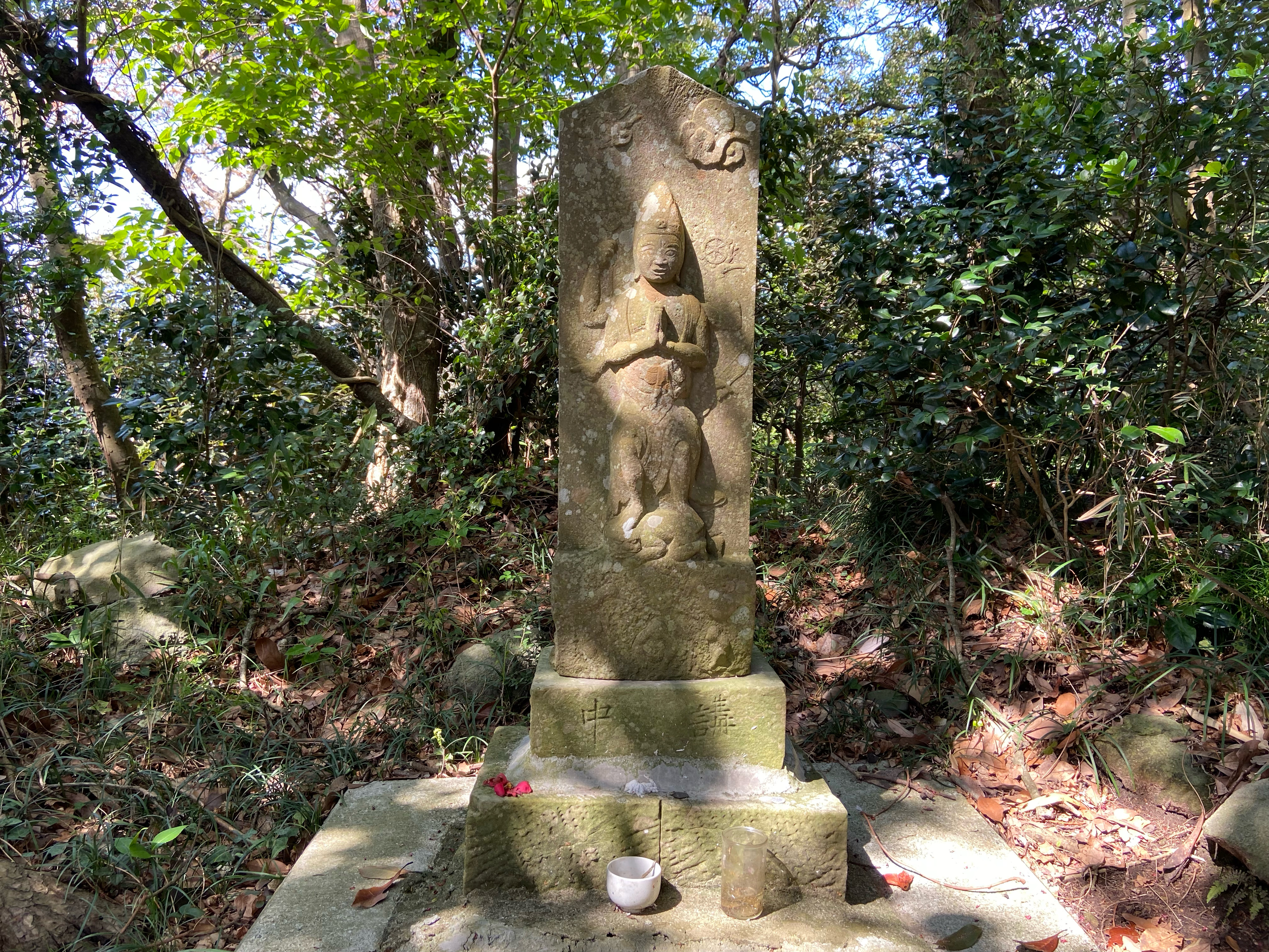 野々島の古道に入り椿のトンネルを通っていくと、途中またまたお地蔵さんたちに出くわす。そのまま熊野神社までむかい、野々島ブルーセンターへ。