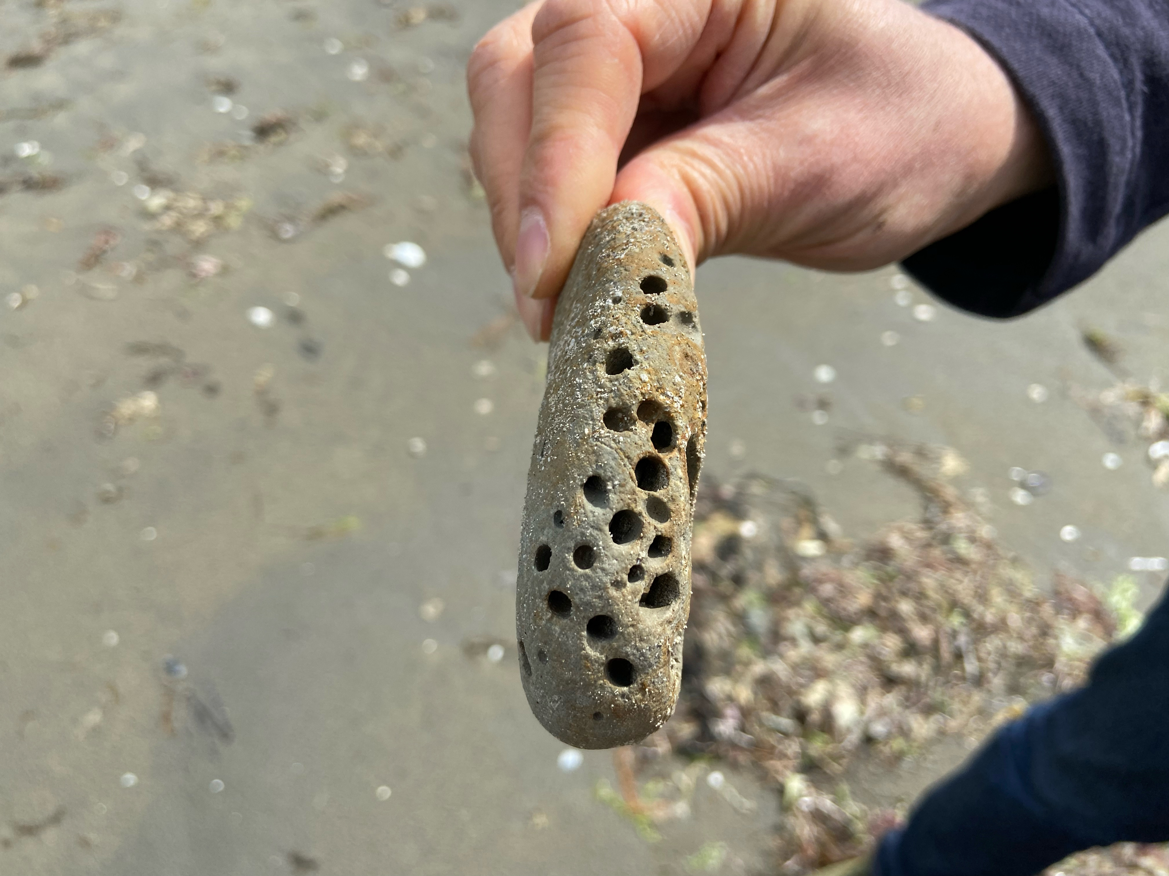 夜泣き地蔵を目指し歩き始めると、宇内浜(うねはま)の標識が見えてきた。浜の方へ降りて行くと、ちょうど潮がひいて砂浜には貝殻や穴の開いた石などがたくさんあり対岸の小さな島まで陸続きになっていた。