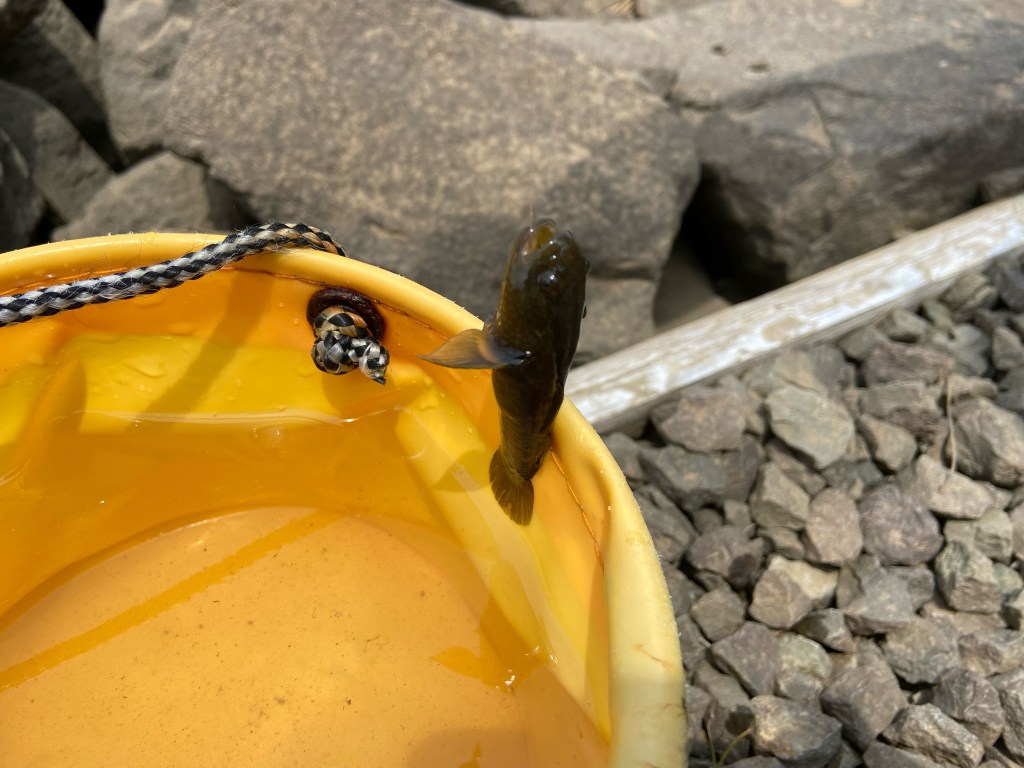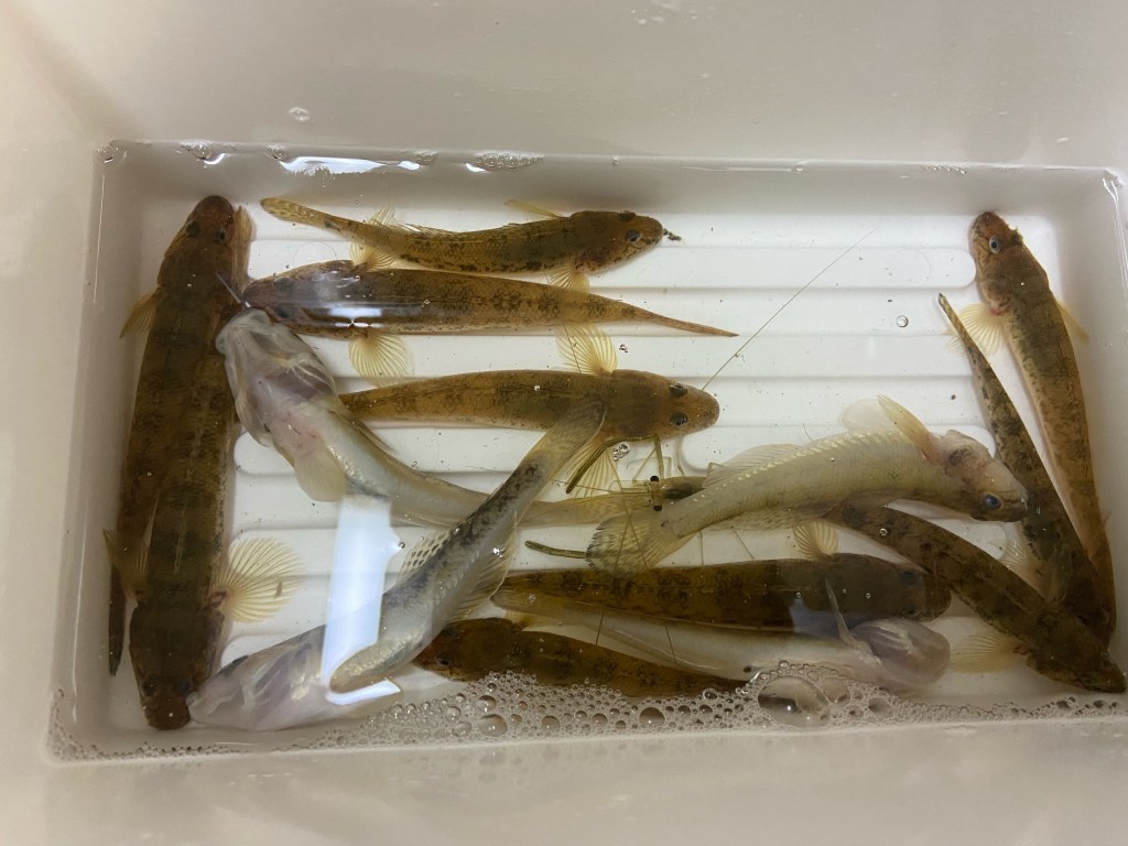 手長エビを釣りに貞山運河に行ったものの、全く釣れない。イソメを使って投げ釣りをする。じっくりと手長えびが釣れるのを探りながら、投げ釣りの様子を見る。「お、あたっている❗️」と釣り上げれば外道のチチブがやたら掛かる。チチブは小さいけど元気がよく好奇心旺盛だ。