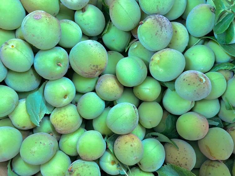 毎日うだるような暑さが続くこの頃。毎日梅の実を眺めては収穫を待ちどうしく思っていた。「さあ、収穫するぞ」の声が上がり、待ってましたとワクワクする。梅の木には蜘蛛や毛虫がいるのでかぶれ防止の為帽子を被り、軍手をつけ薄手の上着を着て収穫に臨む。今年は変な天気ばかりで、実そのものはあまり大きくないが数はかなり採れた。梅ジャムか梅漬けか梅シロップか悩みながらの収穫作業だ。毎年の恒例行事のひとつだが収穫する喜びはひとしおである。