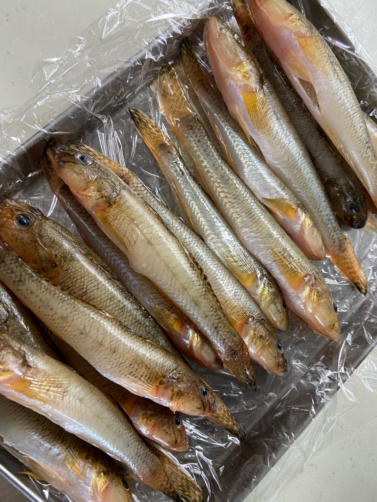 ふむふむ、なになに。ウロコを取り、エラと内臓をキレイに取り除く。さらに塩水でぬめりを取り、パットに並べラップを掛けずに冷蔵庫で半日以上寝かせるそうだ。その後、グリルやオーブンなどで白焼きにし、冷ましたらラップを掛けずに冷蔵庫行きらしい。かなり乾燥させるようだ。エラと内臓をキレイに取り、パットに並べてみた。