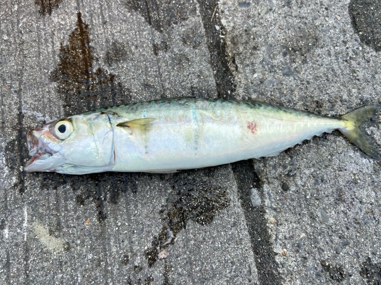キターーーー❗️なかなかのサイズのサバだ。隣の釣り人さんがわしづかみしていたのも頷ける。おもしろいように釣れるのだ。ただ食べる分だけにするのでセーブしながらの釣り。嬉しさのあまりカメラを向けた。