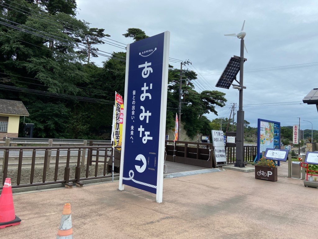 カフェの開店時間まで時間があったので、また一つ寄り道をしてきた。松島町を通り過ぎ隣の東松島市へ。大高森山という小さな山があり、いい感じでテッペンまでの遊歩道が整備されている。その登山口の目の前に「あおみな」という観光案内所が出来たので、そこへ行ってみようと野蒜海岸を後にした。観光遊覧船の発着所の目の前にある「あおみな」に到着した。中には観光案内のほかに地元で採れ加工した海産物が並んでいる。隣にはあおみな食堂があり美味しそうなラーメンがポスターとして貼ってあった。今はお休みしているが海を目の前にした足湯もあり、リフレッシュさせてくれる場所だ。