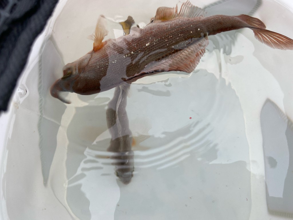 さて今回は冷凍庫のあった冷凍アミエビブロックを使ってサビキ釣りをすることに。サビキ針の下にカゴをセットするスタイル。アミエビとヌカを適宜混ぜたエサをカゴにつめて落とす。「❗️❓」あたった。生命反応あり。大きめなタナゴが釣れた❗️口が小さいタナゴが針に食い付いたら外れないように合わせなければ。しかもサイズがあるので引がいい。慎重にタナゴと合わせてリールを巻き上げる。やった❗️