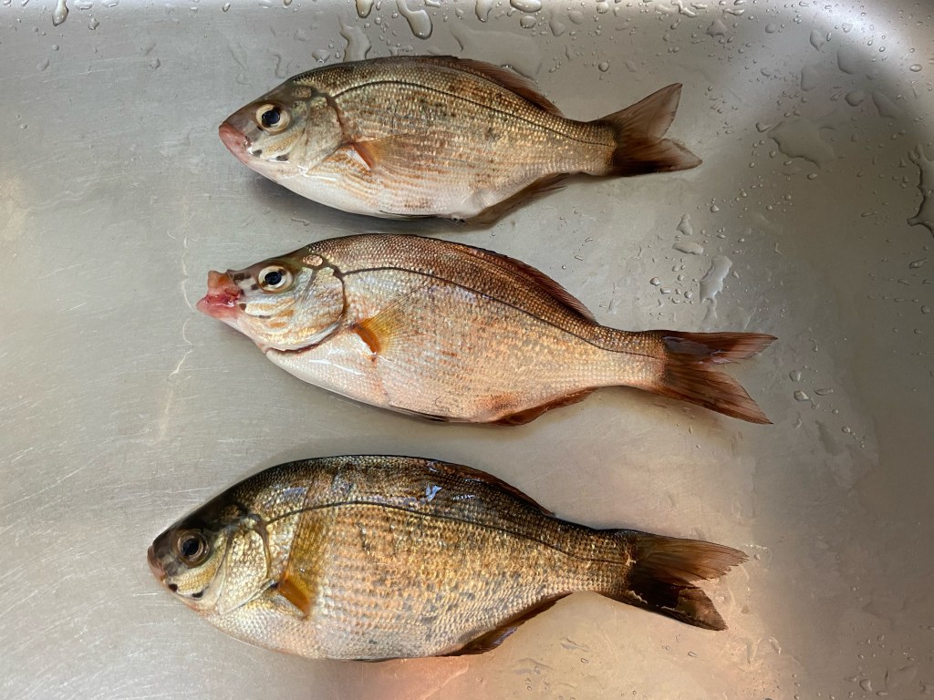塩焼きに適した大きさのタナゴが3尾釣れた。型も揃ってうれしい。何せ引が強いので釣りごたえがある。