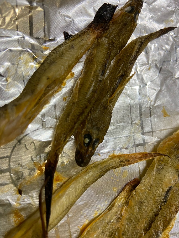 ハゼの焼き干しを作ろうと、工程を進める。ウロコ、エラ、内臓を取り、冷蔵庫で一日いれて乾燥させた。会社から帰宅し今度は焼くために、トースターを使うことにした。トレーにアルミホイルを敷き、ハゼたちを並べた。焼き目を付けたくて高温で焼いたらキュッと詰まって、えんぴつの太さくらいに縮まってしまった。焼けて白く変色したけどキョロッとしてかわいい目がこちらをみている。
