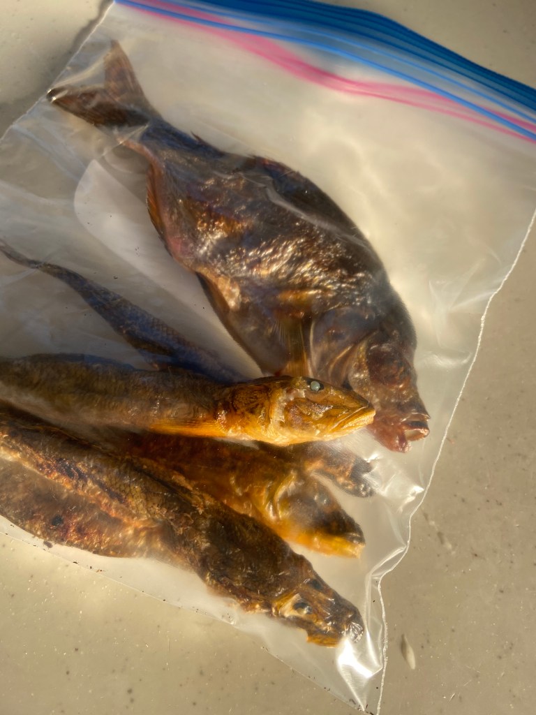 さて先に作っていた大きめのハゼとタナゴの焼き干しが出来上がり、作り溜めしていたダシ専用のファスナー付き保存袋へ投入。こちらもカッチカチだ。特にタナゴはシャモジとしても使えそうな硬さだ。