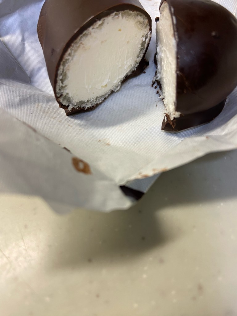 長野県伊那市にある菓子店の伊那のまゆというお菓子、ずーっと恋焦がれてきた。早速開封。生クリームの塊にチョコレートがコーティングされている形はまるで蚕の繭のようだ。ナイフで切り断面を確認すると、生クリームの周りを薄い膜が覆っており、生クリームの塊を維持させている。その膜の上にチョコレートがコーティングしてある仕組みになっていた。その膜とは何でできているのか。生クリームは熱さでとろけてしまうだろうし、その膜でさえ温められたチョコレートをかけられたら柔らかくなり繭の形を維持できなくなってしまう。でも噛んだ食感は最中の皮のように軽い。その製法はお店の俗に言う「企業秘密」ってやつだね。