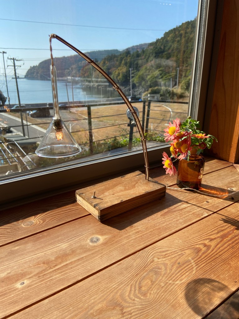 宮城県にある小さな漁港、蛤浜にある古民家カフェ「はまぐり堂」は高台にあり海が見渡せる素敵なカフェだ。予約を入れておいたので、眺めの良い窓際へ席を用意して頂いた。窓は大きくとってあるので太陽がちょうど当たり、この日はポカポカを通り過ぎて暑いくらい。ブラインドを降ろしてもらいランチの食事が来るまで海を見る。昨日までのバタバタさが嘘のようにホッとする時間を満喫できる空間。