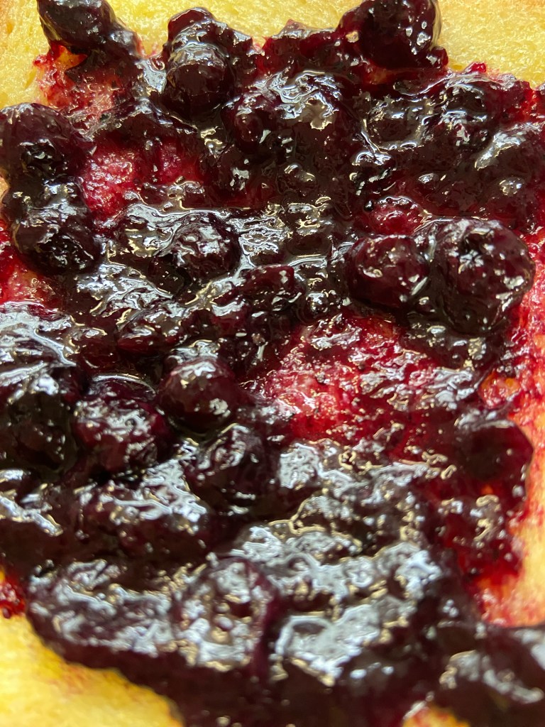 早速、帰ってからトーストにブルーベリージャムをのせてみた。うまそうである。