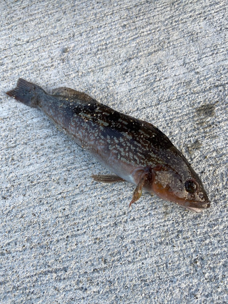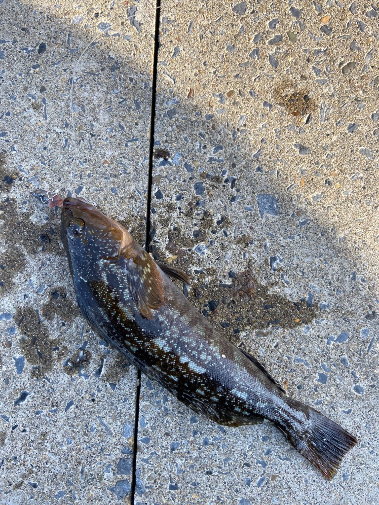 女川町の小さな漁港でムシ餌をつけて一投目。「ん❓」と思ったら「ゴンゴン」来た。おちぱくだ。20センチくらいのアイナメが来てくれた。さらにまたムシ餌をつけ直し二投目、また「ゴンゴン」。これまた同じくらいのアイナメが来た。宮城では25センチ未満のアイナメは環境保護の為、リリースがお約束。どちらもリリース対象サイズなので「大きくなってまた会おう」ということでさようなら。