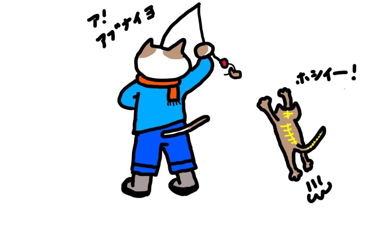 釣り針に餌がついているかチャックしようとリールを巻いて海から引き上げると、漁港ネコたちはそれはソワソワし始める。まだ釣り針に餌がついているとそれを欲しがりジャンプして飛び掛かってくるのだ。「それ魚じゃないよー」となんとか逃げ切り危険を回避。