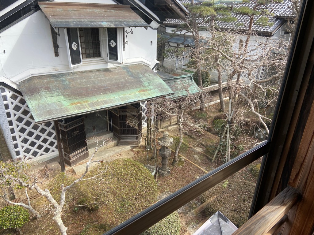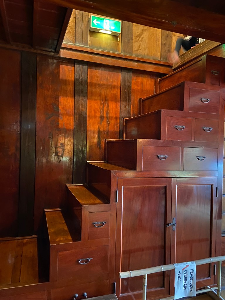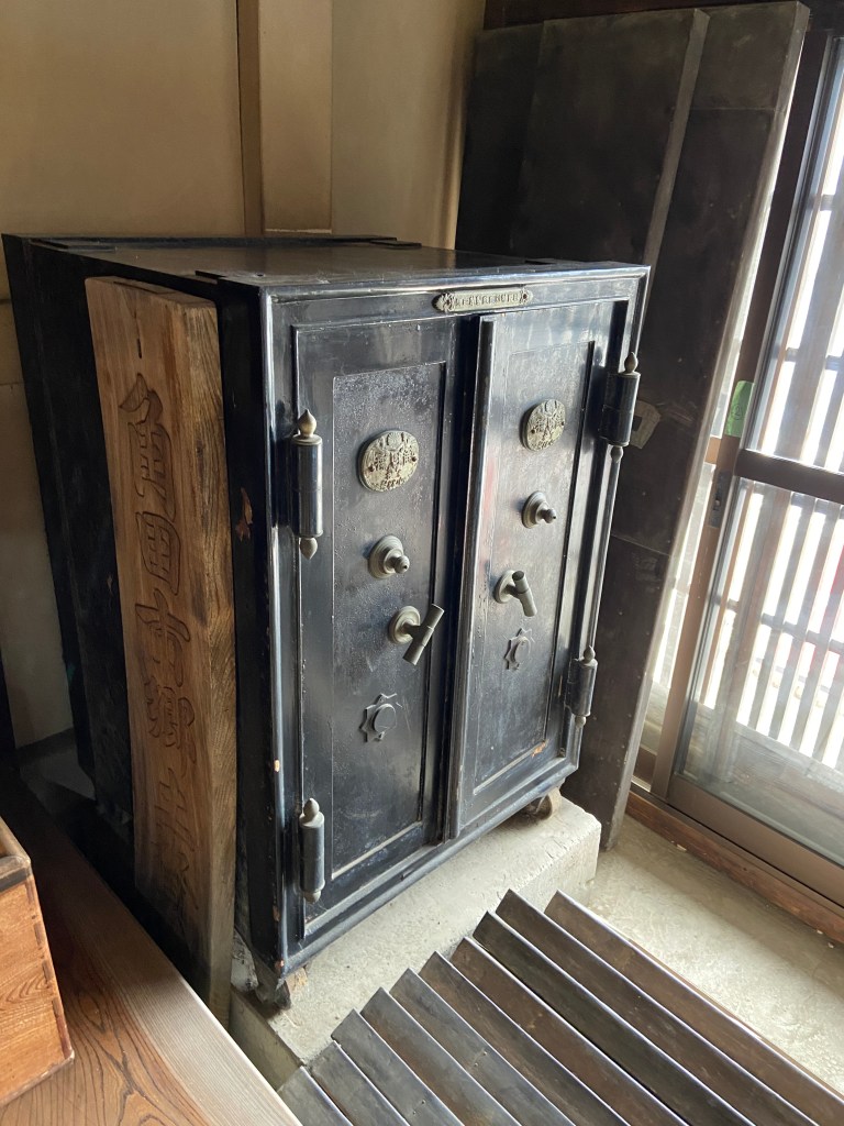店蔵にも展示物があるので見学に。裸電球がレトロさを醸し出していていい感じに照らし出している。昔の金庫もあり(開かずの金庫ではないようだ)大地主の栄華が伺えた。店蔵に階段箪笥で上がれる2階があり急な階段だったが登ってみた。全体的に蔵の中はヒーターが焚いてあったがヒンヤリ。