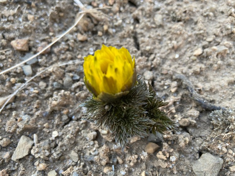 庭のブルーベリーの新芽がかなり膨らみ、枝もぐんぐん伸び始めてきた。どの枝を剪定しようか悩んでいたら、福寿草の花が咲いていた。周りを見るとあちこちから福寿草の花が咲いていたので驚いた。春だな〜。