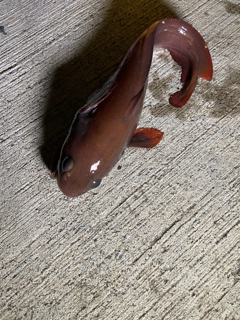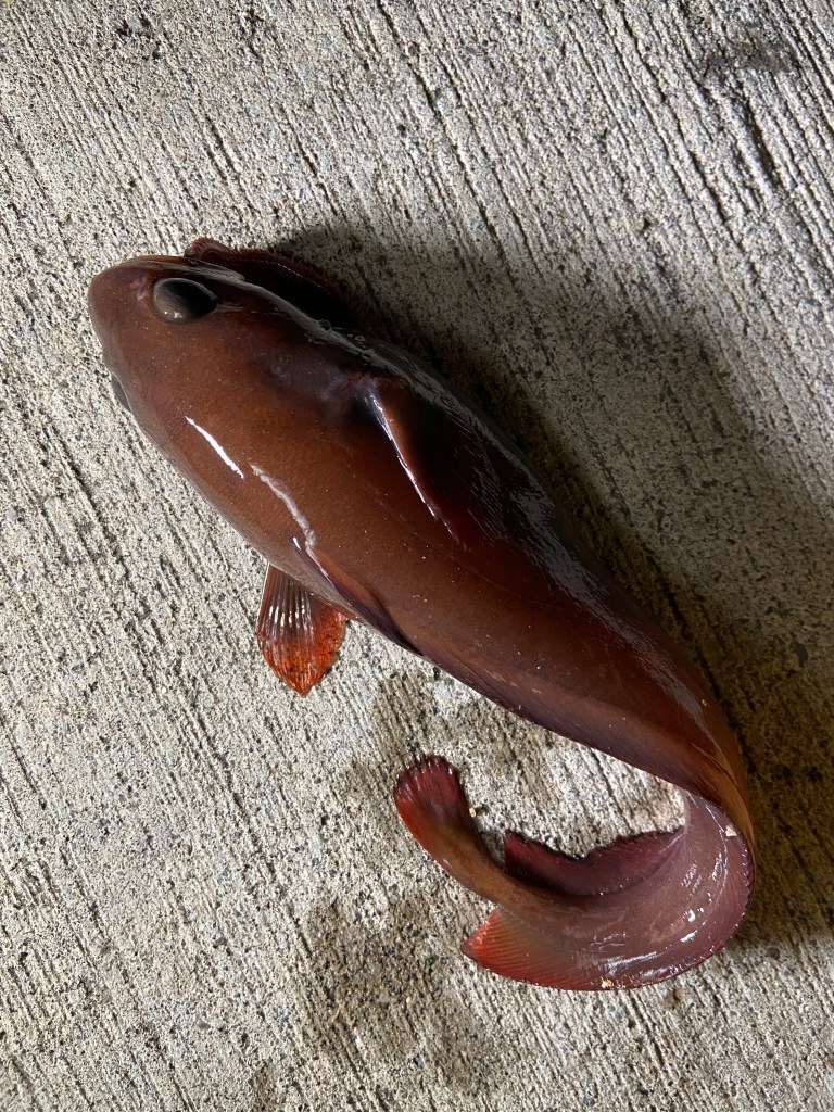 午後遅めの現場到着。夕マズメ狙いだ。あたりはあるもののなかなか釣れない。「遠き〜山に〜日は落ちて〜🎶」のころ、ロットに付けた鈴が鳴る。「お❗️何かついてる」と巻く。「やった❗️ドンコだ」。三陸のアイドル「ドンコ」はまんまる目玉が愛くるしい❤️