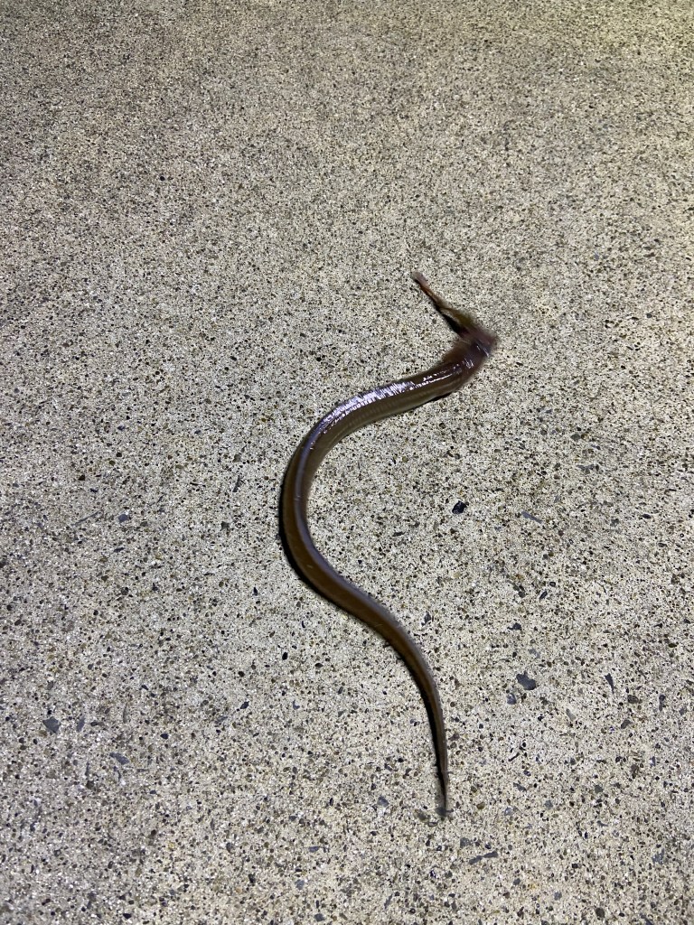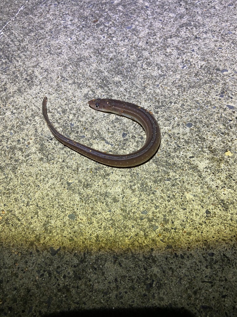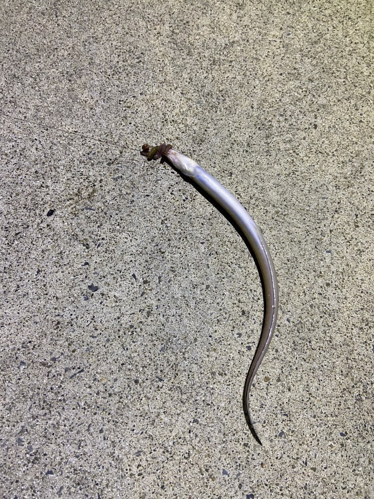 あたりがそろそろ暗くなり始めた頃、立て続けにロッドにつけた鈴が鳴ったのだ。上げてみると確かに重い。でも暴れない。むむむ❗️❓釣れたのはほっそーいアナゴだった。しかも3尾、えんぴつ並みにほっそーいアナゴ。
