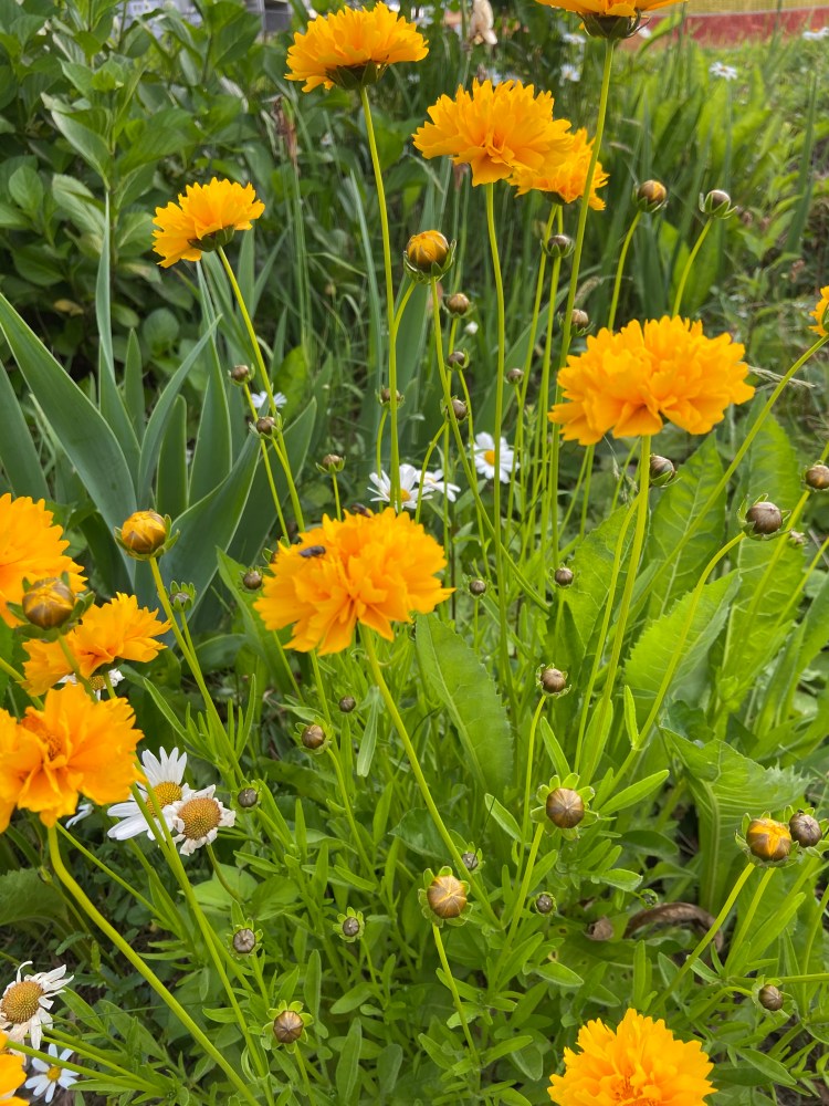 ウォーキングコースには田畑があり、道端にはキレイな花も咲いている。夕方にも関わらず鮮やかな色彩を放つヤマブキ色の花を見つけた。花びらがたくさん、コスモスの仲間かな。