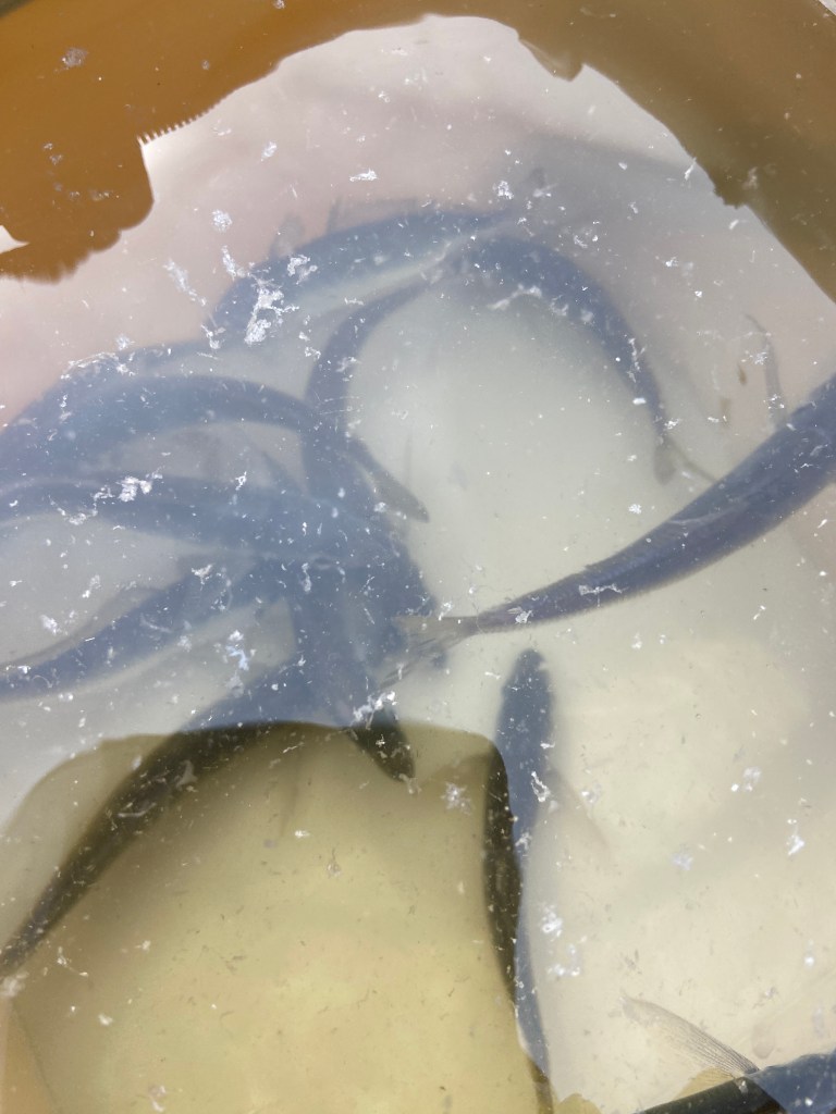 午後から女川町に到着。昼間はサビキ釣り、夜はムシ餌でぶっ込み釣りを予定していた。ところがサビキ釣りを始めた途端、すぐにアタリがあり豆アジが釣れた。「え❗️❓この時間にアジが釣れるなんて」と驚いた。アジって早朝か夜に釣れるイメージ。ところが全く予想外の時間にアジに出会えるなんてと喜んだのも束の間、すぐに豆アジのアタリ連発で爆釣。大変だ❗️