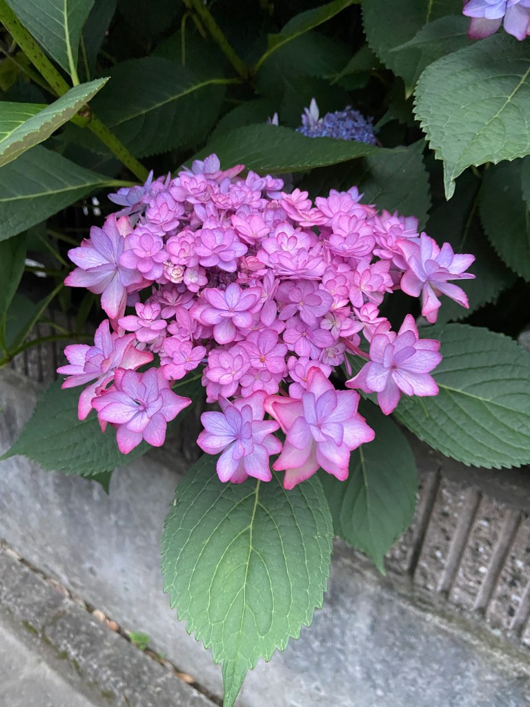 今回はルートを替え、夕方でも照りつける太陽を避けるように住宅街にした。テクテク調子よく歩き始めると、アジサイがあちこちで満開だ。キレイに手入れされているそのアジサイは、なんと縁に濃い色が付いているのだ。なんてきれいなアジサイなんだろうと、うっとり。幸いそのアジサイはその家のフェンスから外側に出て咲いていたので、思わずカメラを向ける。