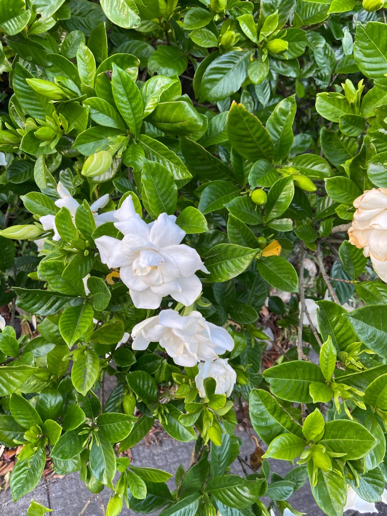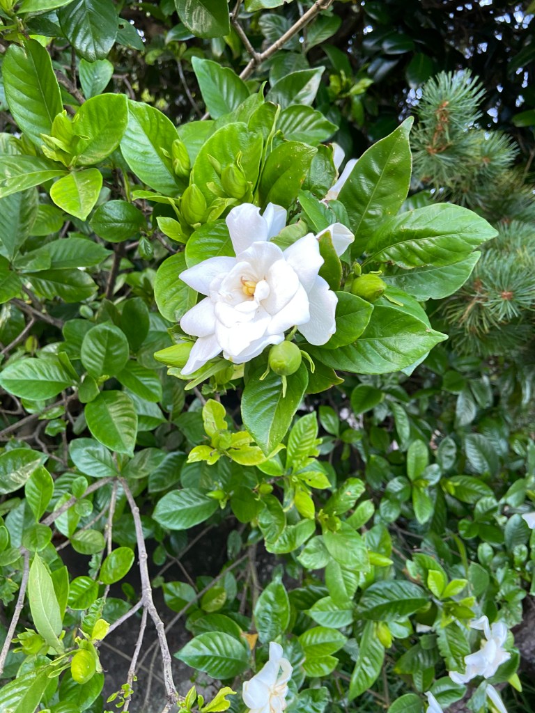 ウォーキングをしていて気になっている花がある。低木で緑が濃く、葉の表面にはクッキリとした葉脈が走っている。しかも白い花びらが何枚も重なって、オシベやメシベが見えないくらい。そばを通るとアマ〜い香りがするのだ。よその家の庭にたくさんの花をつけて咲いているので、通るたびになんだろうと気になっていた。
