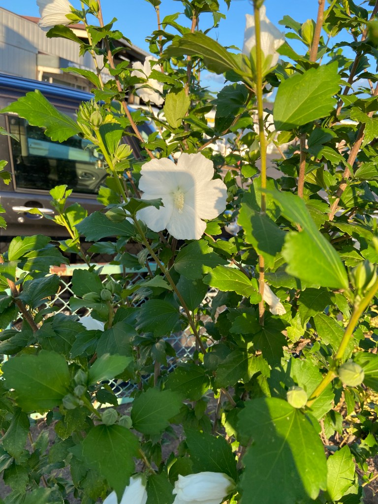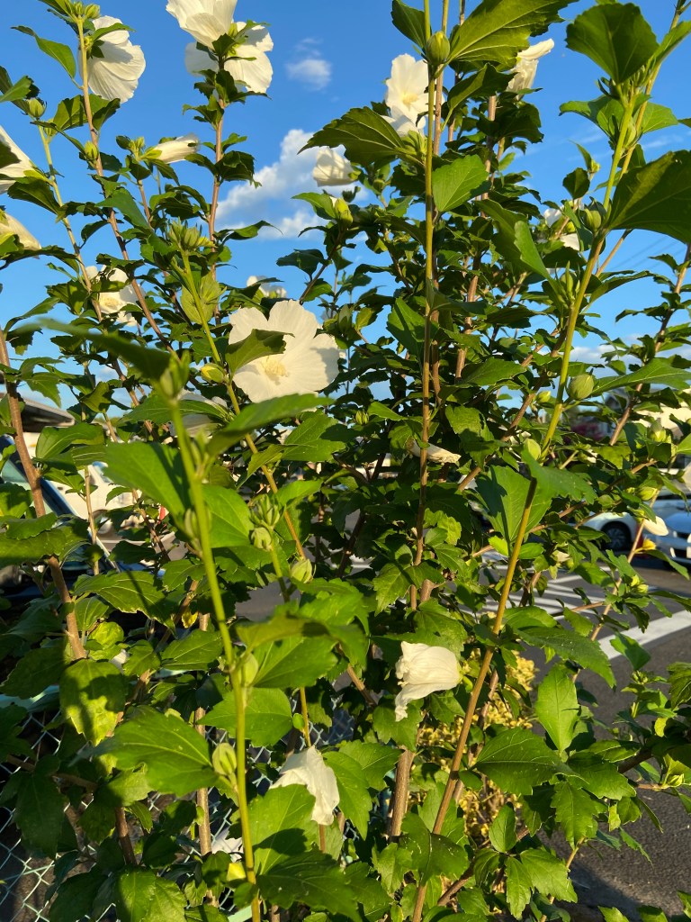 夏の庭木でよくみるのが「ムクゲ」という植物。葉を付けた枝がまっすぐ空に向かって伸び、その枝に白い花やうす紫、ピンクの花を付ける。自分が見つけた「ムクゲ」は白い花で、夏には白い花がよく似合うな〜と見ていた。ハイビスカスの花に似ていると思っていたら、アオイ課フヨウ族(ハイビスカス属)に属する落葉低木の植物だった。やっぱり❗️