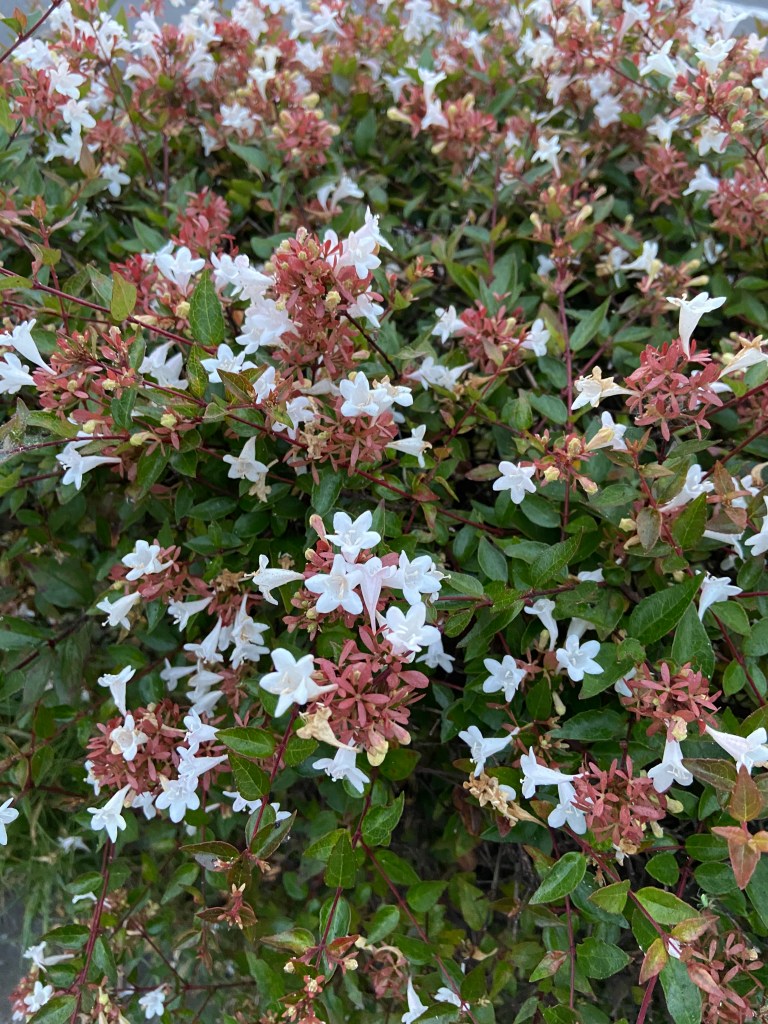 そんな毎日を花の観察が日課になりつつある日、「これーーーよく見るヤツ❗️」会社でも植栽に使われていて、近くを通るとふんわりいい香りを放つ。その名も「アベリア」だ。中国が原産で、日本へ入ってきたのは大正時代。どこかで必ず見るかなり馴染みのある植物である。
