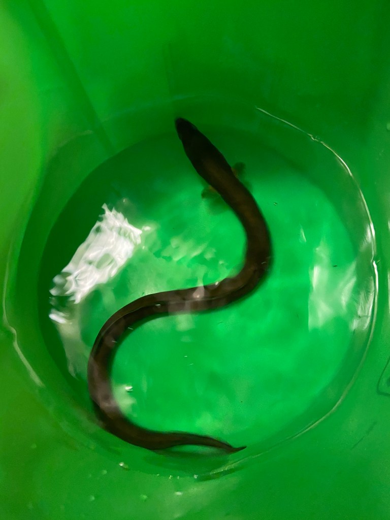 捌く前に泥抜きをしなくてはならないので、スカリに入れて一週間くらいこのまま放置。時折、水を変えながら泥を吐くのを待つ。
