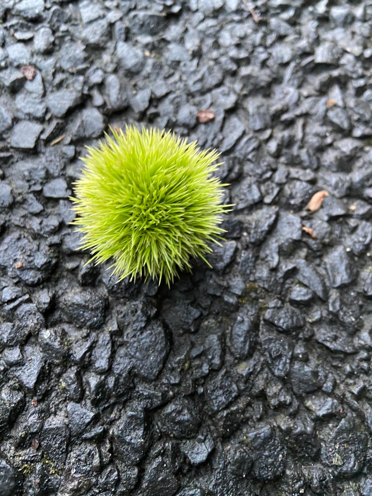 さてウォーキングをしていると、あれ❓そろそろ❓と秋の気配を感じるようになった。日中は毎日茹だるような暑さ。しかも毎日熱帯夜。そろそろ疲れもピークに差し掛かり、秋まで体力が持つだろうかと不安だが、季節は必ず動いていると感じられるモノが落ちていた。キレイな黄緑色のイガ栗だ。なんだかんだ言っても季節は秋に向かっているね。まん丸でかわいいので思わずカメラを向けた。