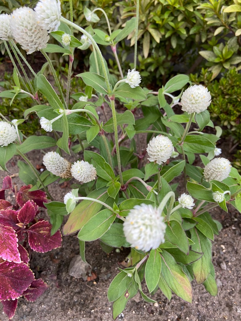 カレー屋さんの店先に、キレイに手入れされている花壇がある。結構な頻度で花が入れ替わるので、カレーの匂いに誘われついでに通るたびに見惚れてしまう。今回は千日紅(センニチコウ)の白い花が植えられていた。小さくまん丸で白の千日紅だが、自分は濃いピンクや赤紫色しか見たことがなかったのでじっくり観察だ。