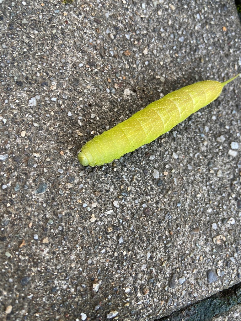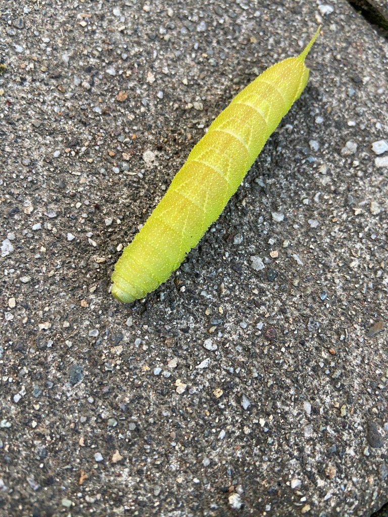 そんなキミドリ色はこの時期の虫たちも纏っている。「ツユムシ」も然りだが、今回ウォーキングで見つけた幼虫もキレイなキミドリ色だ。蛾の幼虫。人間の指くらい太くて長い。でもニョコニョコと歩く姿はかわいい限り。