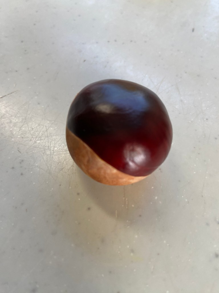 そんな日のウォーキングで、そのフサフサが落ちていたのだ。「やった❗️」と皮を剥いてみたら、中からまん丸の栗に似たような実が出てきた。「かわいい❤️」と一つだけだったが持ち帰ることにした。栗と同じくらいの大きさだが、ほんとまん丸なのだ。
