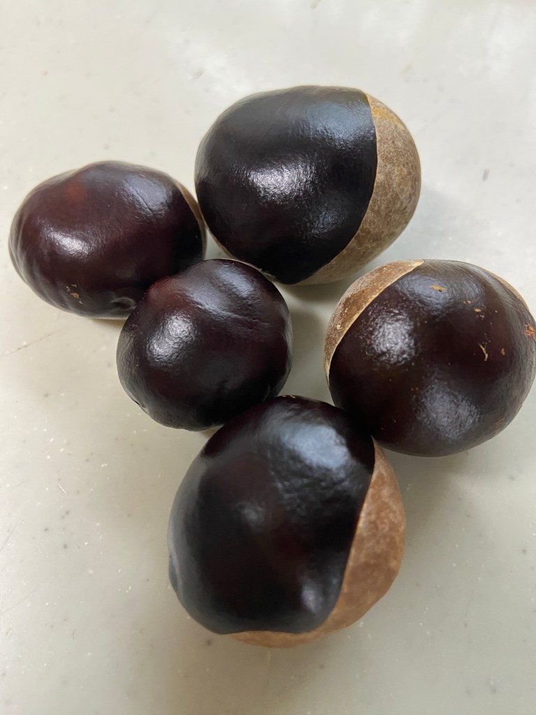 そんな朝、皮がついたままのトチノミがコロコロと歩道に落ちているではないか。足でいとも簡単に皮を剥ぐことができ、中からコロンとした実が出てきた。