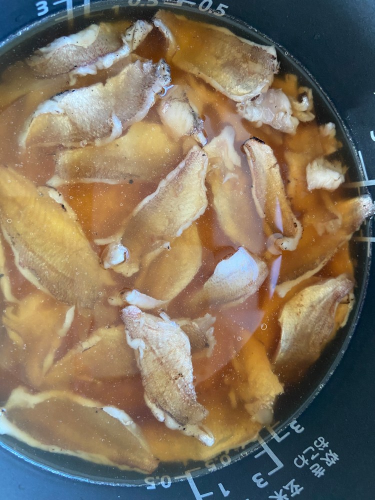 ボーンから出汁を取りたいので、一旦茹でこぼし臭みを取る。その後すりおろした生姜と一緒に5分ほど煮出し、チャリコの出汁が出来上がる。炊飯器に洗った米、酒、醤油、塩、みりん、出汁を入れ最後にフィレをのせる。小さなチャリコから出る魚のアブラがわかるだろうか。スイッチオン。