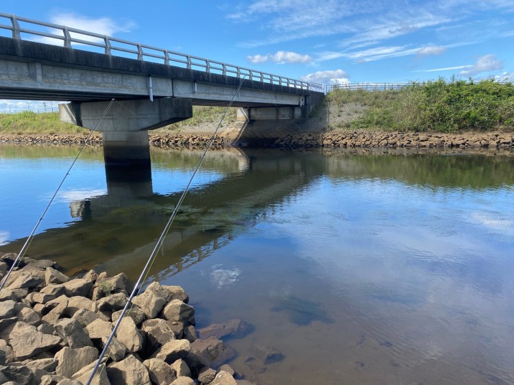 本日大潮なので着いた時点で超干潮だったが、風もなく水がものすごく澄んでいる。今までこの運河では見たことのない澄み具合だ。こんなに澄んでいるならもしかして魚は釣れないかもしれない。