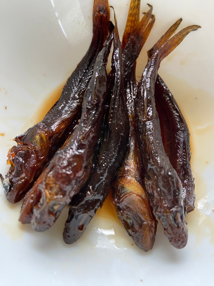 さて下処理の工程を全て終わらせ、いよいよ調味料とハゼを鍋に入れ煮つける。時折甘塩っぱい香りが充満し、この香りだけでご飯が食べられそうな気になる。ツヤツヤの甘露煮が完成し、記念にカメラを向けた。