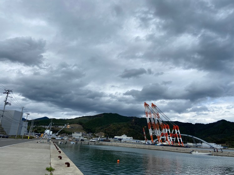 程なく、空いている場所があったのでここに決めた。女川町本土と離島を結ぶ橋を作っているのが見える場所。この女川漁港の端っこでは離島と結ぶ為の橋を作ってるのだ。大きな建造物の他に、それを海から運ぶであろう巨大なクレーンが乗っているサルベージ船を見ることができた。とにかくデカい。
