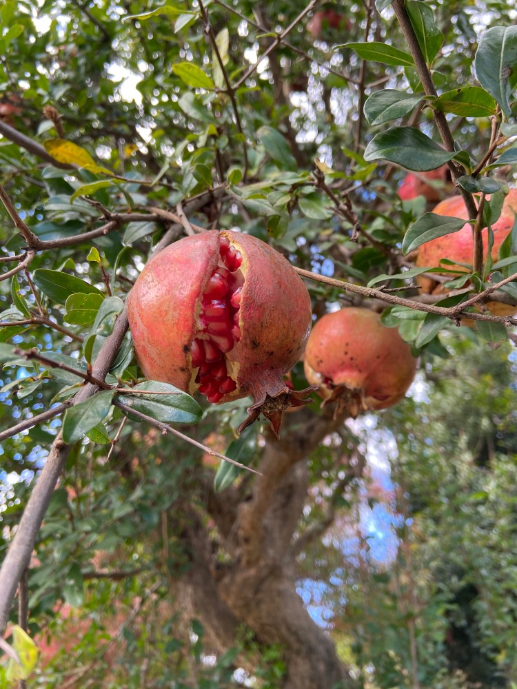 ご近所の庭先に、毎年咲く「ザクロ」がある。けっこう年代もので、高くそびえ立っている樹木だが、毎年たわわに「ザクロ」の実をつける。そばを歩くと大きな実をつけた枝が手に届くくらいまでしなっているので、じっくりと観察できる。