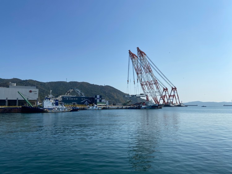 祝日を含め3連休の初日に、よく行く遠征先女川町の漁港周辺へ釣行。おかっぱりのアングラーなので、場所を探すのにクルマで魚市場周辺や対岸をぐるぐる回ってみたが、ものすごい人、人、人の釣り客たち。午前中早めにINしたにも関わらず、すでに遅し状態。しかもいつもの勘違いファミリーばかりで「これではゆっくり、静かに釣りはできん」とここら周辺は諦めた。が、この女川町と離島の架橋工事が遅れているとメディアの報道で聞いていたが、今回巨大クレーンが橋の一部を吊り上げて動いているのが見えたのでカメラを向けた。