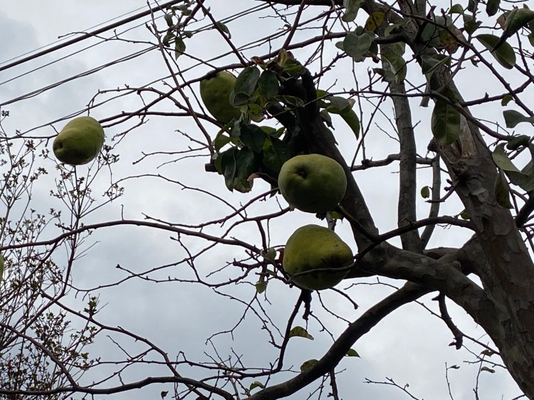 秋が深まってきたようだ。園芸店を営んでいるおうちの広い庭には道路に面しているところにカリンの木がある。ヒョロヒョロと背の高いかりんの木には大きな黄緑色のカリンの実がついている。カリンはバラ科の植物で、中国原産らしい。