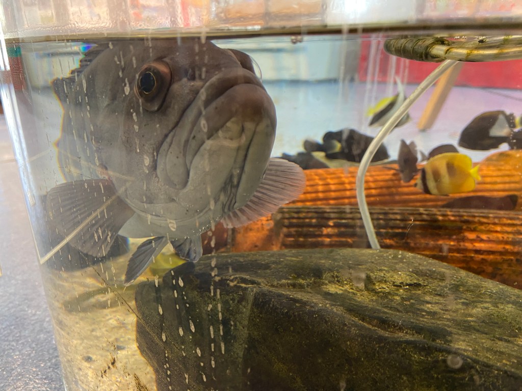 ホエールタウンおしかの中にある、観光案内所の生簀にいたマハタ。近海で採れたお魚も入っている。エサをもらえると思ったのか近付いてきた。かわいい🩷