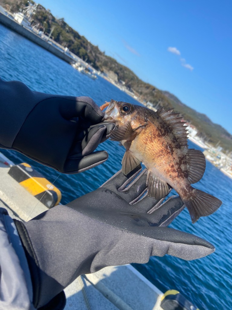 そんな「鮎川港」で早速、釣り開始。ブラーにムシ餌をつけて探ってみると、すぐにアタリが。小さいメバルが頻発だったが、落ちパクでしかもすごく引くアタリ。上げてみるとプックリとした身幅で体高のあるメバルをゲット。さすが釣れるとウワサの「鮎川港」だ。