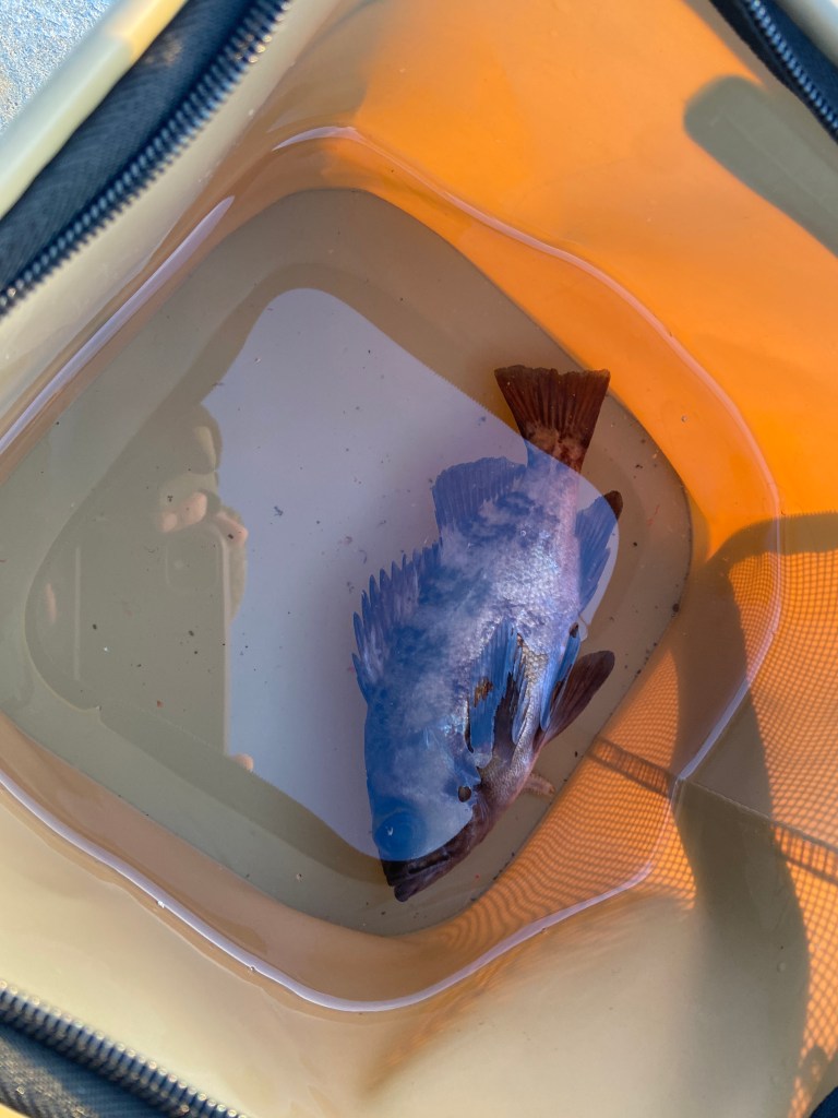 この日は珍しく風もなくポカポカな陽気で、防寒着を脱ごうか迷ったぐらい。そんな中、5グラムのブラーにムシ餌をつけて第一投。するとすぐにアタリがあり、お持ち帰りサイズのメバルが釣れた❗️これは幸先良いではないか。