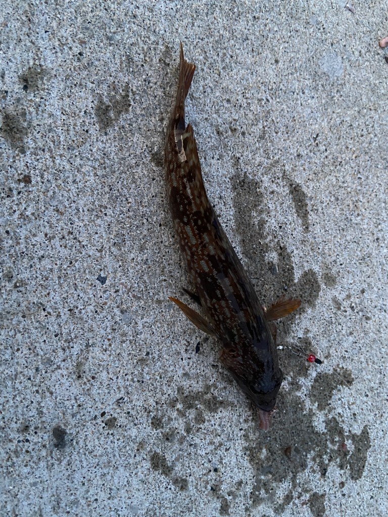 その後もサイズは小さいが、アイナメが連発。25センチ未満のアイナメは環境保護のため、リリースしなくてはならないというお触れがあるので「また会おう」と海へ離した。メバルよりも小さなアイナメの巣があるらしく、投げればアイナメが釣れてしまうので場所を少々移動することに。