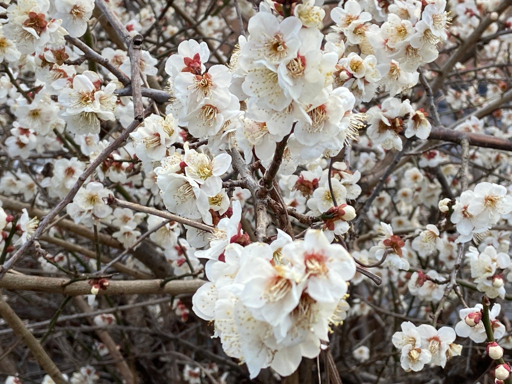 梅がやっと咲き誇る気温の休日、出掛けた先で見事な梅の花があった。結構な大木で民家の裏庭に咲いていて、ほとんどノー手入れ状態。それが功を奏してか、見事な咲っぷり。