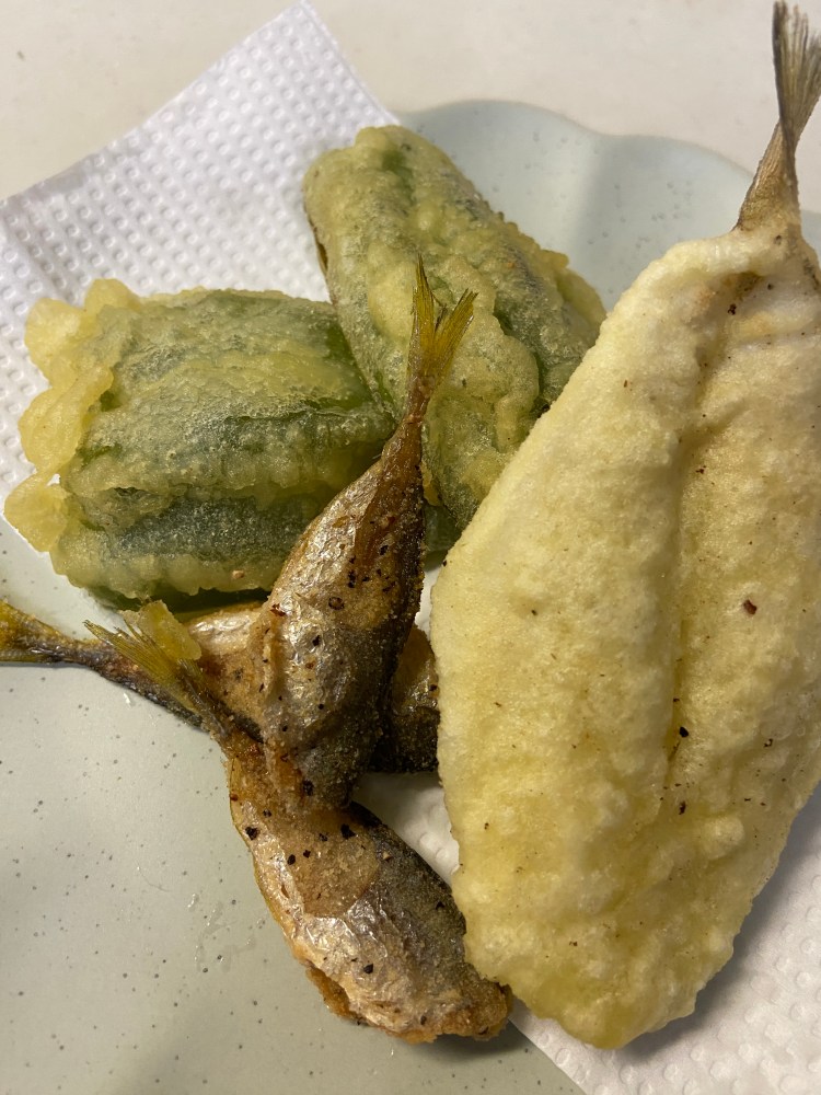 非常に乏しいキスの天ぷらと豆アジの唐揚げ、ピーマン天ぷらを添えて自然の恵みに感謝して「いただきます」