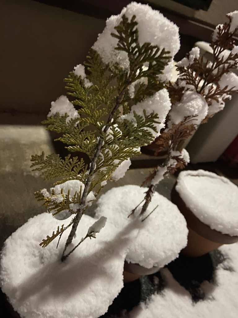 庭のコニファー。モッサリ積もったし、一日中真冬日だ。