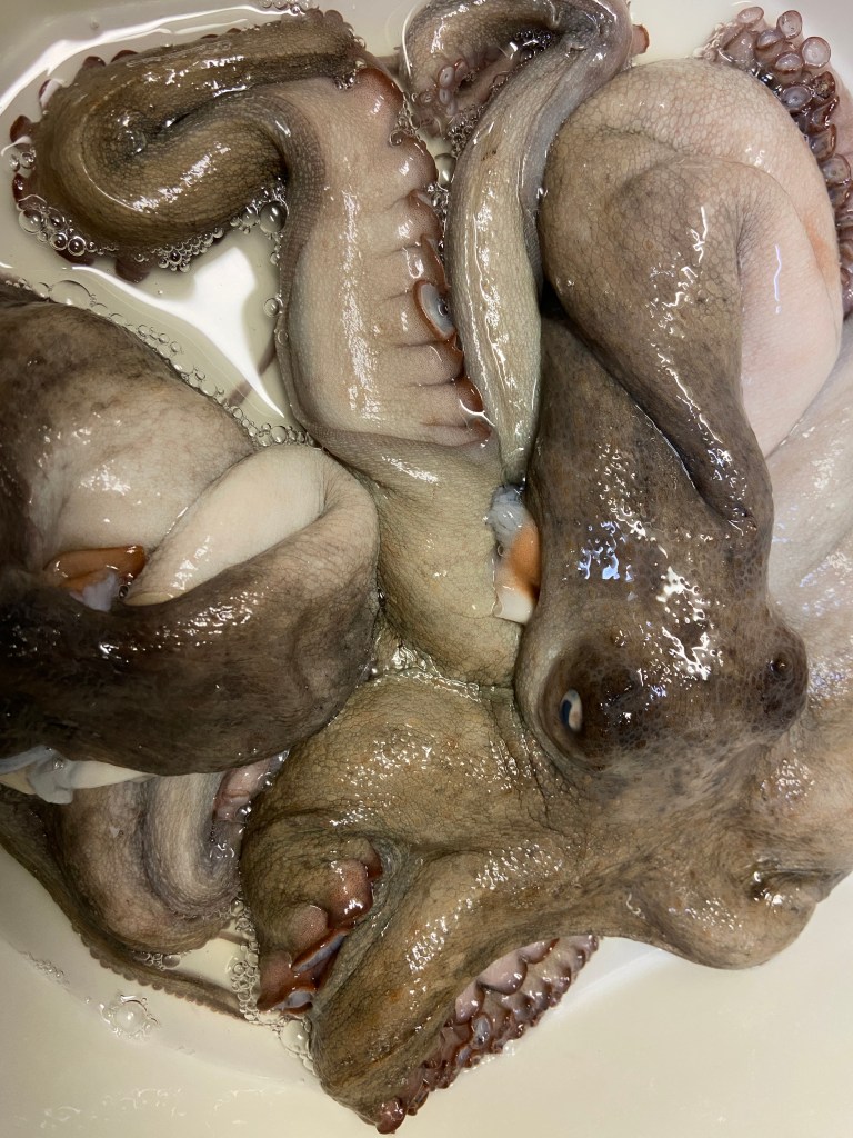 「買うと高いんだよ、ホラ持っていけ」と2タコも。「えええー、お父さんの分なくなるよ」というと、「タコ漁しているからいつでも食べられる」とお優しいお言葉。有り難く頂戴しましたとも。お父さんありがとうございました。